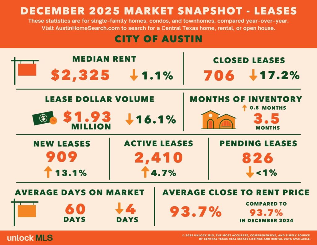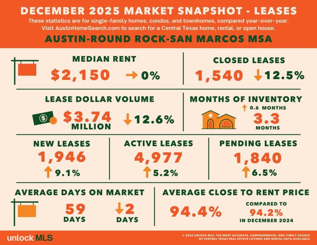 The Austin metro rental market remained price‑stable but less active. Total lease activity fell about 13% year‑over‑year, while median rents held steady compared with December 2024.