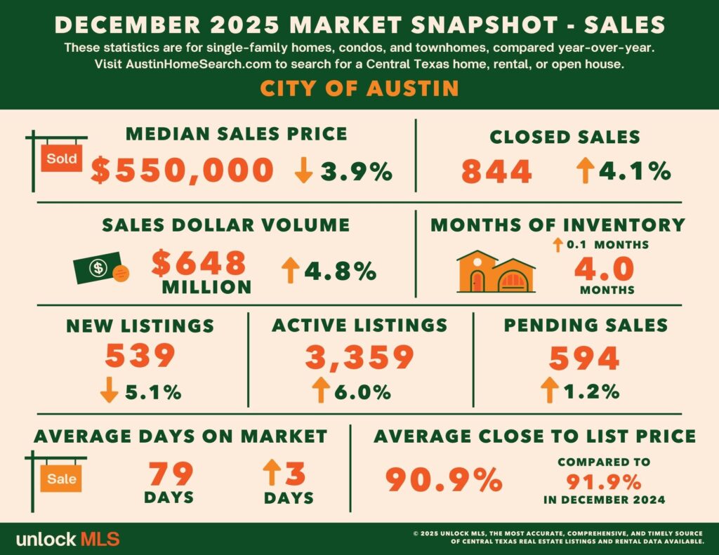 The broader Austin metro area reported a median home price of $435,000 in December, down 3.3% year‑over‑year. Despite the continued price correction, closed sales increased 1.9% to 2,514 units, while total transaction volume edged up 1.4% to $1.43 billion.