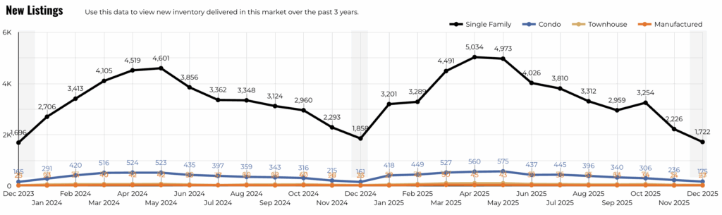 (Note: All housing market charts are sourced from Unlock MLS. Due to slight differences in reporting periods and geographic coverage, minor discrepancies in numbers may exist. Please focus on overall trends and market structure when interpreting these signals.)