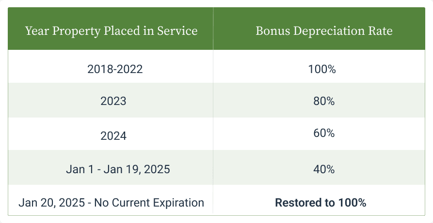 Here’s the urgency: Bonus Depreciation was phased out beginning in 2023, stepping down each year. But thanks to the recent One Big Beautiful Bill Act, it has been restored to 100% and made permanent.