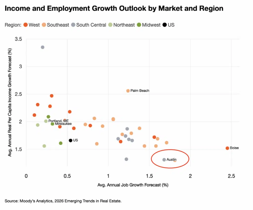 Austin combines a deep tech ecosystem, high skilled workforce, and strong job growth prospects. Although a sizable multifamily pipeline, roughly 4–5 percent additional inventory in 2026–2027, may weigh on near term rent growth, it can also create a more attractive entry point for long term capital.
