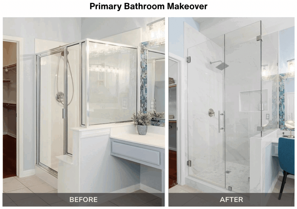 The primary bathroom got a true upgrade: a frameless glass shower, large-format white tiles, a built-in wall niche, and energy-efficient lighting. It now feels polished, bright, and refreshingly simple to maintain.