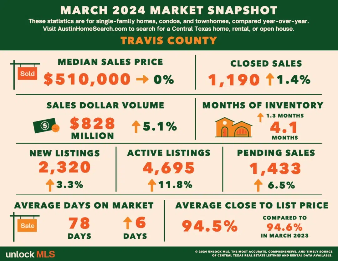 In March, the median price of homes in Travis County remained flat year-on-year at $510,000. There were 1,190 transferred homes, and 2,320 new listings. There were 1,433 pending sales. There was a 4.1-month supply, with an average time on the market of 78 days.
