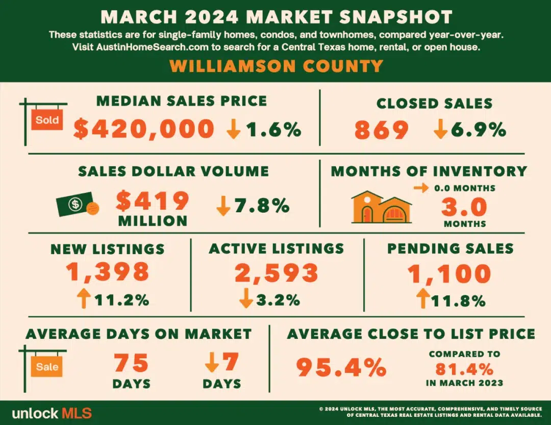 Williamson County covers the four major cities north of Austin. The median price of homes in March was $420,000, a decrease of 1.6% year-on-year. There were 869 transactions. There were 1,398 new listings, 2,593 active listings, and 1,100 pending sales. There was a 3-month supply, with an average time on the market of 75 days.