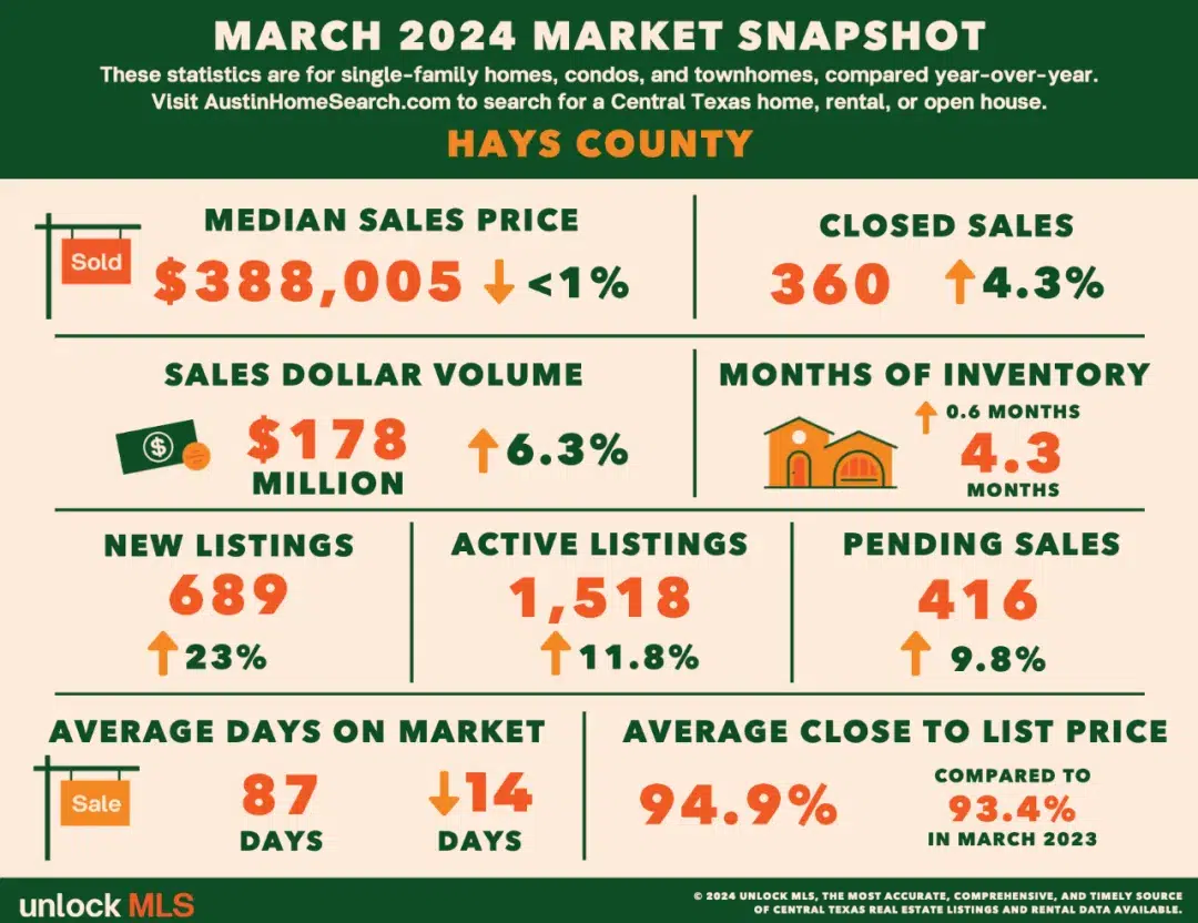 In March, the median price of homes in Hays County was $388,005. There were 360 transfers, 178 new listings, 1,518 active listings, and 416 pending sales. The average time on the market was 87 days.