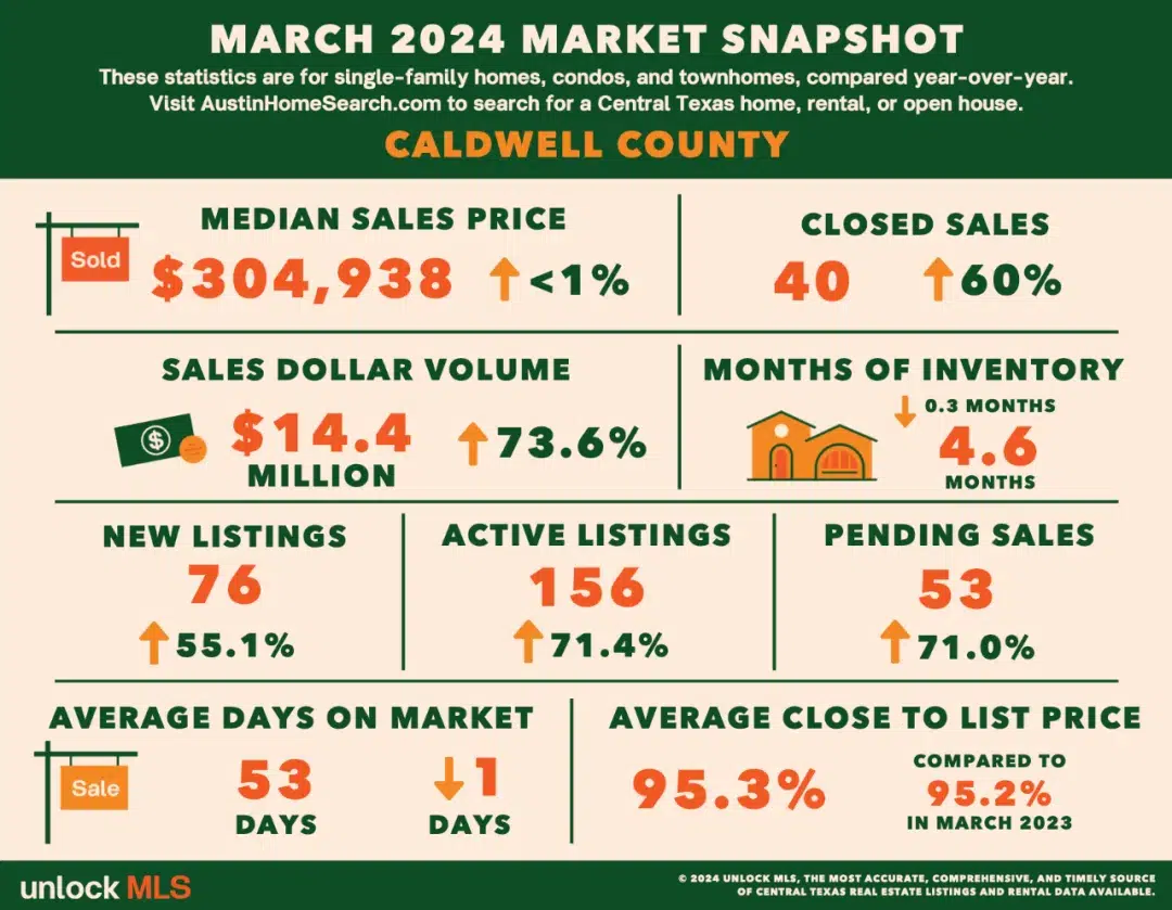 In Caldwell County, the median price of homes in February was $304,938, almost unchanged year-on-year. There were 40 transferred homes, a 60% year-on-year increase. There were 76 new listings, 156 active listings, and 52 pending sales.