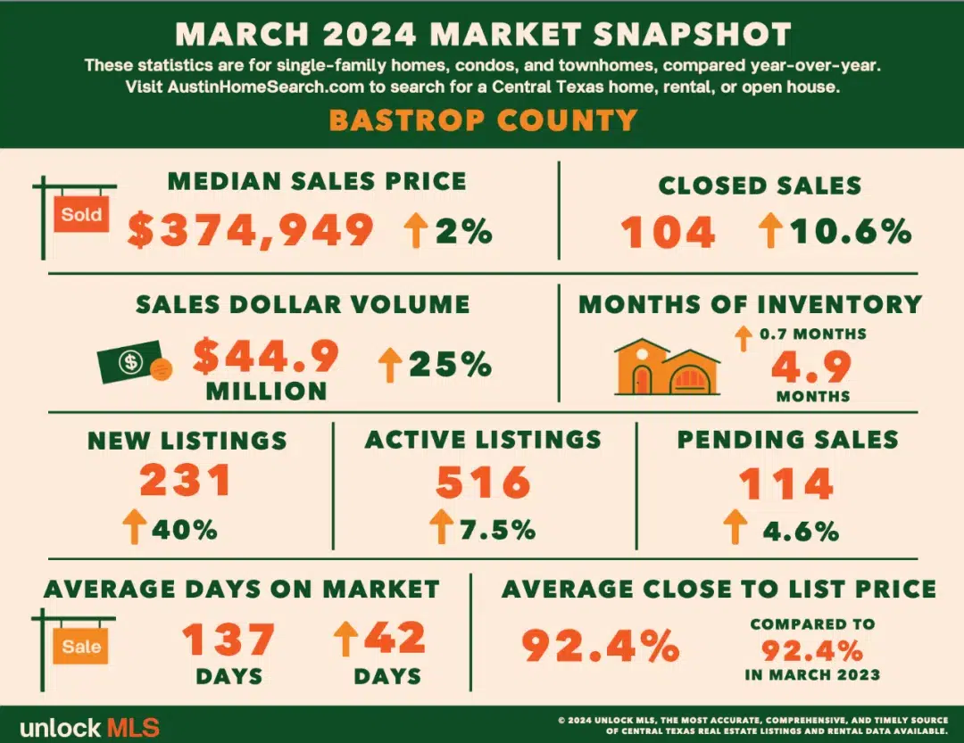In Bastrop County, the median price of homes in March was $374,949, a 2% year-on-year increase. There were 104 transactions, a 10.6% year-on-year increase. There were 231 new listings, 516 active listings, and 114 pending sales.