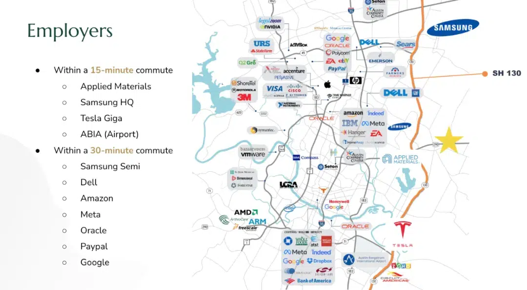 Manor is strategically located near major tech employers. Semiconductor giant Applied Materials is only 4.8 miles away, while Samsung’s Austin headquarters is 5.8 miles west. Samsung’s new $40 billion factory is just 16 miles north along Highway 973. The Tesla Gigafactory and the international airport are only a 25-minute drive away, making Manor a preferred residential choice for many Tesla employees.