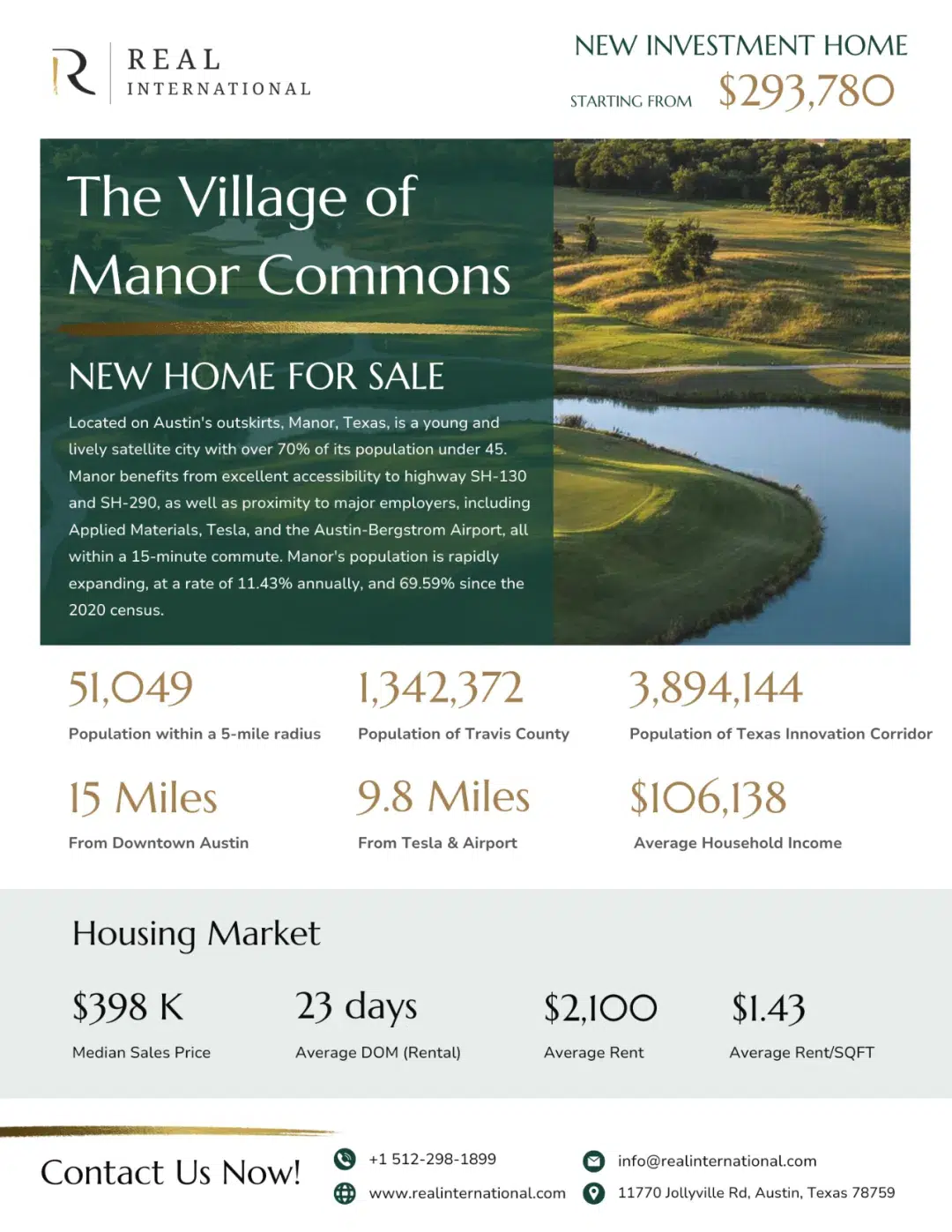 Our team at Real International has secured exclusive discounts on newly built single-family homes in Manor, just 15 miles from downtown Austin. Fully furnished, move-in-ready residences start at an attractive $293k. Whether for personal residence or investment, Manor offers substantial long-term appreciation and stable rental income potential.