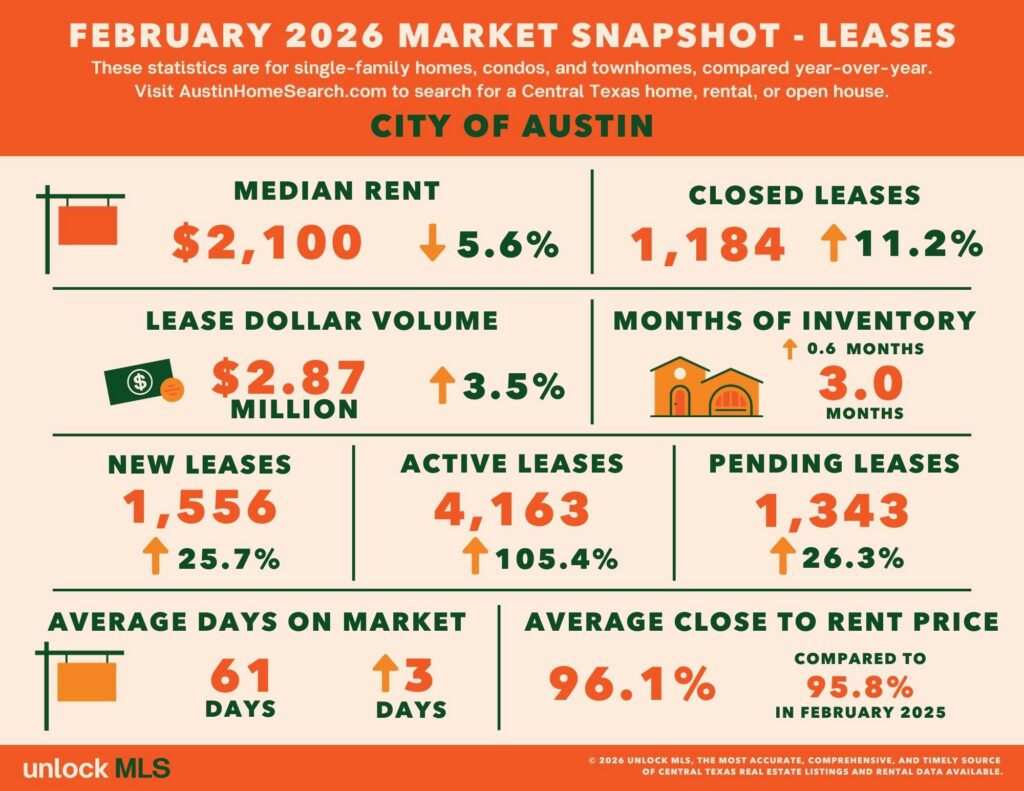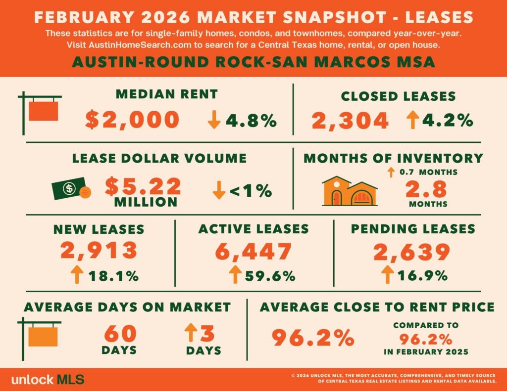 In February, the Greater Austin rental market continued to face heavy inventory pressure. The median rent fell to $2,000, down 4.8% year-over-year, while lease closings rose 4.2%.