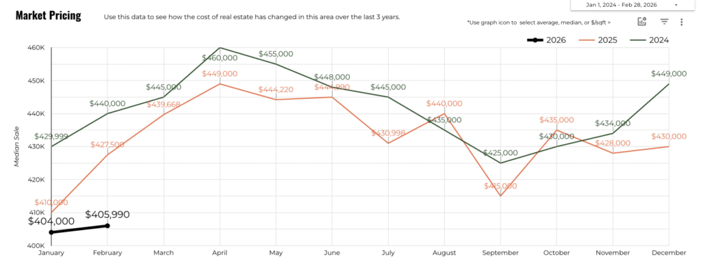 Across Greater Austin Area, the median home sale price in February reached $412,000, down 3.6% year-over-year. The price trend line for 2026 shows a gentle upward curve between January and February, signaling that Austin’s spring homebuying season has officially begun.