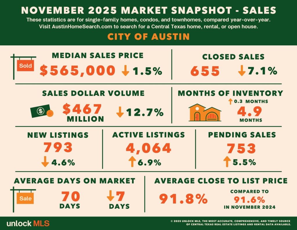 In November, the median sales price across the Greater Austin region reached $429,900, down 1.1% year over year, reflecting overall price stability rather than a sharp correction. Closed sales volume declined 15.9%, underscoring a more cautious buyer environment and longer decision cycles.