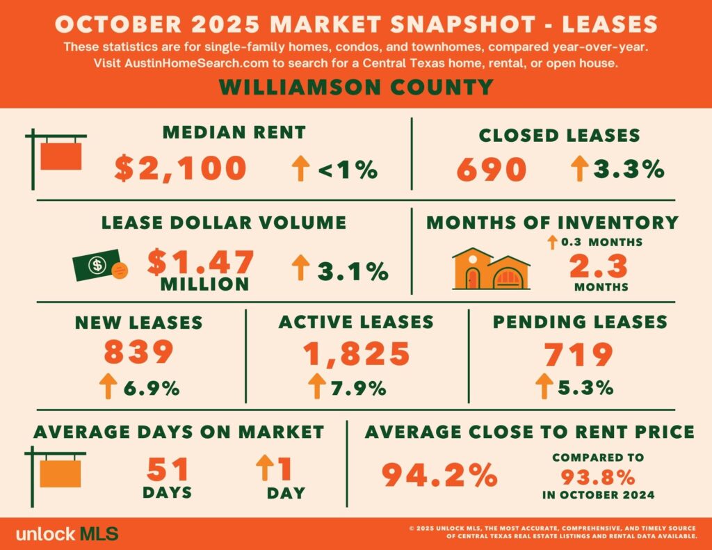 Williamson County, meanwhile, showed steady and reliable demand. Both closed leases and total lease volume increased year over year, making it the most stable rental submarket in North Austin. Bastrop and Williamson thus reflected two different but healthy profiles: “active growth” versus “steady strength.”
