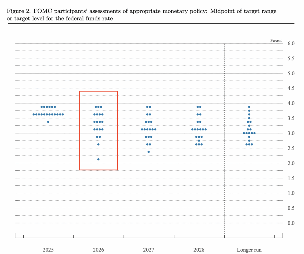 Alongside the rate decision, the Fed released its updated dot plot, offering the clearest picture yet of what policymakers expect in 2026. The new projections show that most officials anticipate only one more rate cut next year, bringing the median forecast for 2026 to roughly 3.4%. In other words, after a year of more aggressive easing, 2026 is expected to be slower, more cautious, and far less predictable. The committee remains divided on how quickly inflation will return to target and how much additional policy support the economy may ultimately need.