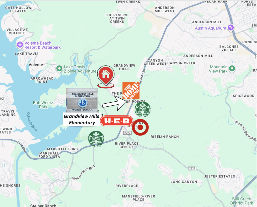Short drive to The Domain, Q2 Stadium, and Lake Travis